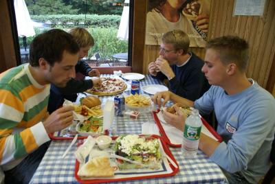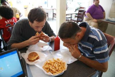 gerai, kad turiu tikrai stipriu vitaminu, nes butu grazios pradzios pabaiga. negaliu valgyti to, kas cia valgoma. sumustiniai... is tiesu tai tas pats vistienos saslykas arba graikiskos salotos, tik igrustos i gabala duonos... gerimai... visi spalvotieji ir jokiu sulciu... tiesa, gera ant butelio limonado matyti uzrasa "pagamintas is tikru apelsinu" arba "pagamintas is tikru apelsinu sulciu"... idomu, kas yra netikri apelsinai? ir gal is tiesu labiau baisu nei idomu... genetiskai modifikuotas maistas nera zymimas specialiais zenklais. parduotuveje issirinkti piena sudetingiau nei irodyti einsteino reliatyvumo teorija... visas jis su vitaminais, beveik be riebalu ir dar "organinis"... pasiklydau saltu baltu buteliu begalybeje... vakarais dazniausiai einam i graikiska uzeiga, kur ant sienos kabo meteoru vienuolynu nuotrauka... jie net turi graikisku salotu, bet tai tik salotos ir feta... visa kita - sumustiniai. mazos porcijos - didesnes nei gali suvalgyti suauges zmogus... dideles porcijos - dar didesnes uz mazas. majamyje juokemes, kai gavom dovanu "extra large" fulbright marskinelius... bet juokai juokais... uz metu tokie ir busim... ir dar nuolat kartojamas pamokslas... when in america - do as the americans do. noriu ryziu!!!