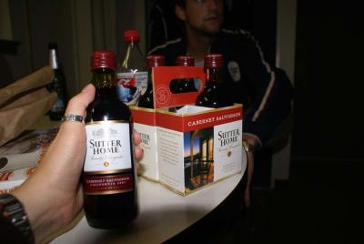 o kalifornijos vynas - merlot ar cabernet sauvignon - pardavinejamas mazuose butelaiciuose po keturis... kaip alus...
